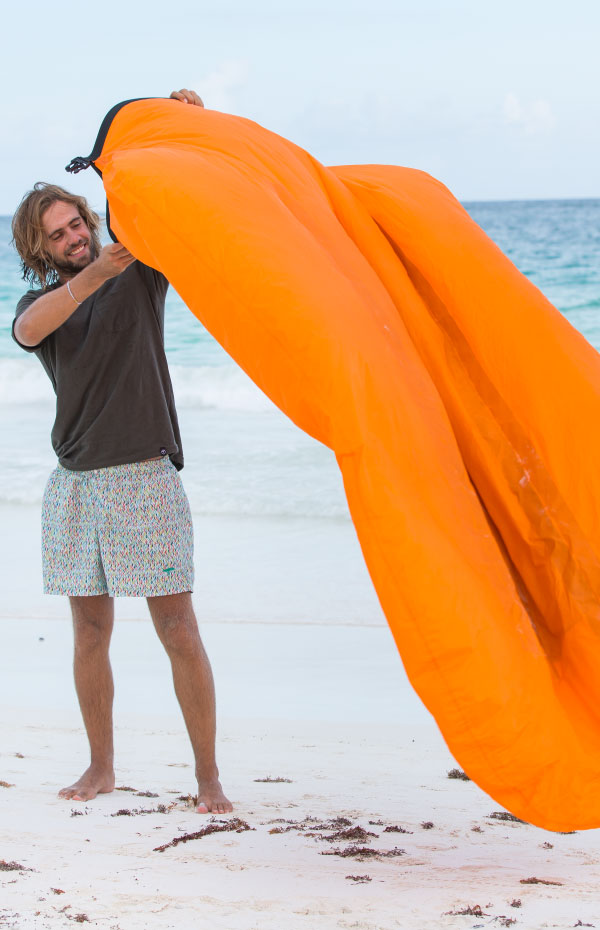 Con el mismo sistema innovador de inflado sin inflador, te traemos un nuevo diseño de la versión del famoso puff. Al no tener bolsa interna lo hace más apto para su uso en el agua. Se infla rapidísimo.La tela es nylon con doble capa de poliuretano interna y externa.